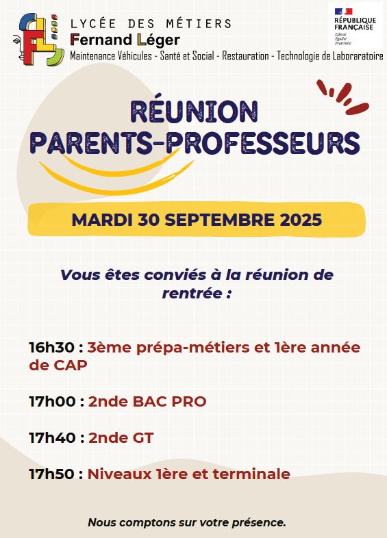 Vous êtes conviés à la réunion de rentrée qui se tiendra le mardi 30 septembre 2025 au lycée Fernand Léger.